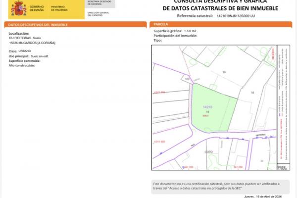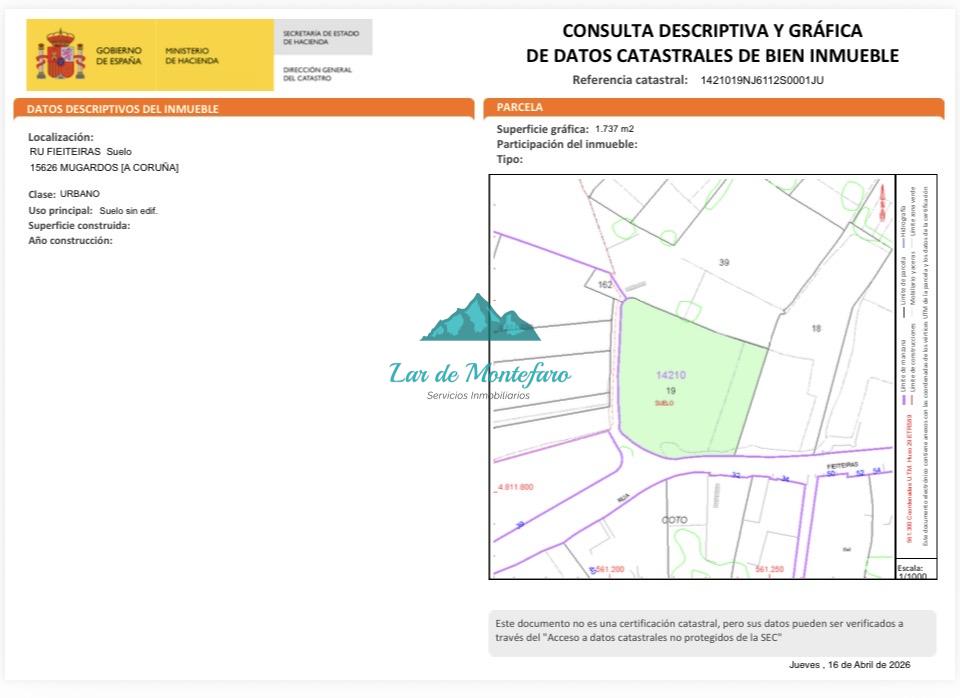 Ponemos a la venta este magnifico solar urbano de 1737m2 según catastro, en Av Fieteiras, en Mugardos, a sólo 5 minutos en coche del centro de la villa, y a 25 minutos Ferrol, o a 35 de A coruña.