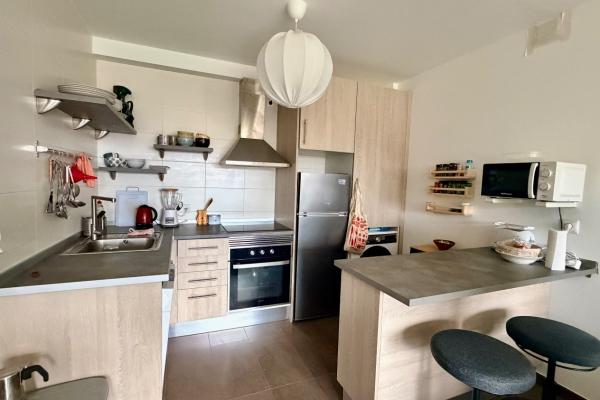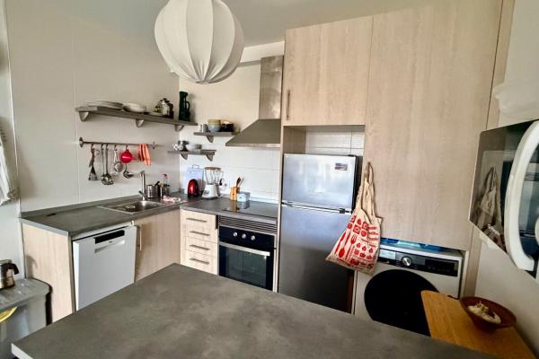 -Cocina americana con salón comedor muy luminoso y vistas al mar.
